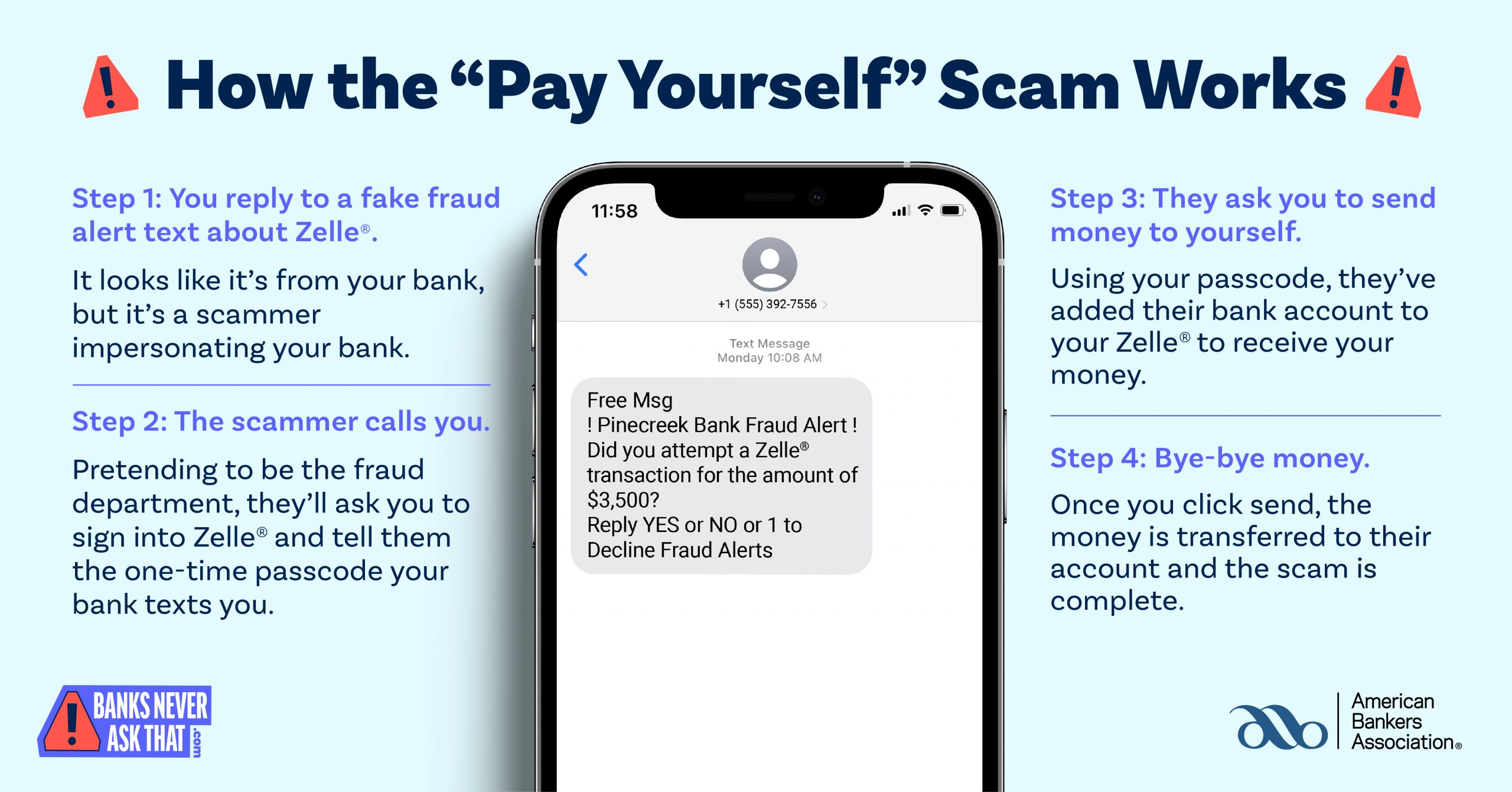 Scammers imitate a bank representative and trick you into sending money to their own account by telling you to send it to yourself to “secure” it from fraud. The scammer often starts with a fake, urgent text message about fraudulent activity, and then uses phone calls and social engineering to get you to authorize a transfer to an account they control, not one of your own.